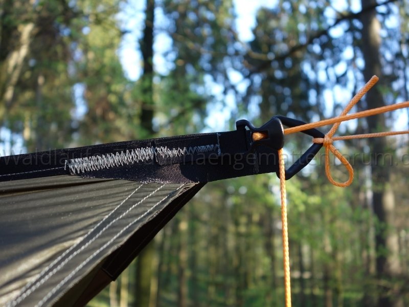 Bei meinem Tarp sieht es inzwischen nicht mehr exakt so aus wie im folgenden Bild. Nach wie vor tropft aber allfälliges Wasser am Kunststoff-Dreieck nach unten ab. Es gelangt gar kein Wasser unters Tarp. Die Leine geht nicht unter dem Tarp weiter:
