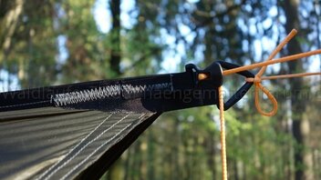 • Nachdem ich jetzt gerade die letzten knapp 2 Wochen mit der HM draußen geschlafen habe und auch mal richtig starken Prasselregen über 2 Std. lang hatte, kann ich nur sagen, dass ich ohne Abtropfschnüre komplett trocken geblieben bin. Die Aufhängungen waren natürlich naß, aber sobald die Seile unter das Tarp und etwas später an die Karabiner kamen, war Schluß mit Feuchtigkeit.