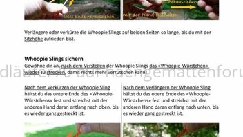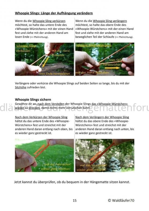 Bezogen auf die der Hängematte beiliegenden Whoopie Slings bedeutet das: Wenn ich die Länge der Whoopie Sling verkürzen will, halte ich das der Hängematte zugewandte Kanalende locker fest und ziehe mit der anderen Hand am losen Ende der Whoopie Sling: die verstellbare Schlinge verkleinert sich. Wenn ich die Whoopie Sling verlängern will, halte ich das dem Baum zugewandte Tunnelende lose fest und ziehe mit der freien Hand mehr Seil aus dem Tunnel, so dass die verstellbare Whoopie Sling verlängert - dabei muss ich aber den Zug, der durch die Hängematte auf der Whoopie liegt, entlasten, indem ich die Hängematte entleere oder das Hängemattenende unter die Achsel klemme (s. o.)