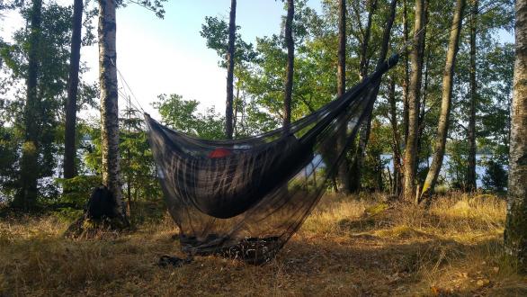 • Hier nochmal ein kleiner Nachtrag zu diesem Thread, mit dem ich mich für euren Input bedanken möchte. Das Bild zeigt "Kind" in Gathered End Hängematte mit dem Snugpak drunter. Da ich für die Hängematte seinerzeit ein komplettes Moskitonetz genäht hatte, war es ein wenig fummelig, den Underquilt drunter zu bamseln, ging dann aber nachher doch ganz gut. Der Sitz war ausreichend gut - durch die Temperaturen fielen Kältebrücken entweder nicht auf oder waren willkommen.