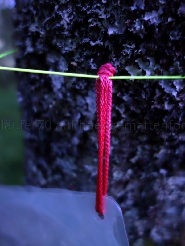 Ein weiterer Vorteil des Prusikknotens ist, dass man das Tarp direkt am Evo-Loop befestigen kann (siehe Link), wenn man das möchte. Dank dem Prusikknoten bleibt das Tarp gespannt, auch wenn sich keine Last in der Hängematte befindet. Doch das ist ein anderes Thema...