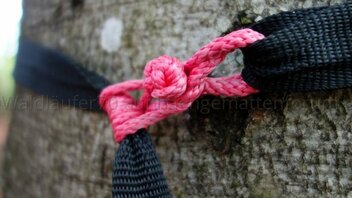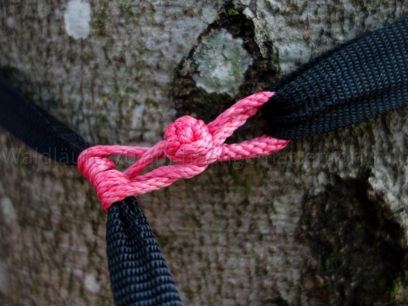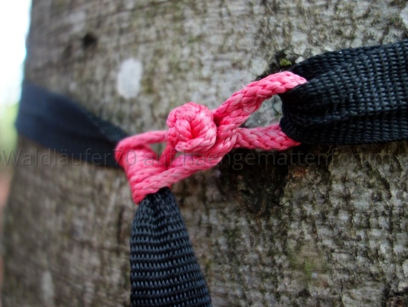 Was mich allerdings daran bei Zeiten genervt hat, war die Ast-Problematik. Wenn es z. B. ein Nadelbaum war, an dem ich mein Band gehängt hatte und merkte, dass ich noch höher muss mit der Hängematte, dann war da oft ein oder mehrere Äste im Weg, so dass ich die gesamte Gurtverbindung wieder abnehmen musste. Das war bei Birken oder Linden nicht der Fall, aber es hat mich oft genug genervt. Mit einem Bandende, das sich leicht öffnen lässt, konnte ich einfach die notwendige Distanz schnell überbrücken und wieder fixieren (vorausgesetzt, die Hängematte war noch nicht mit Schlafsack und Zeug beladen und zu heftig gezogen).