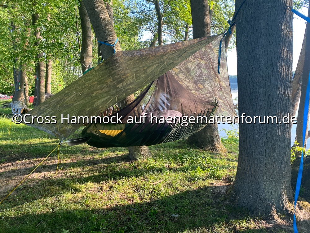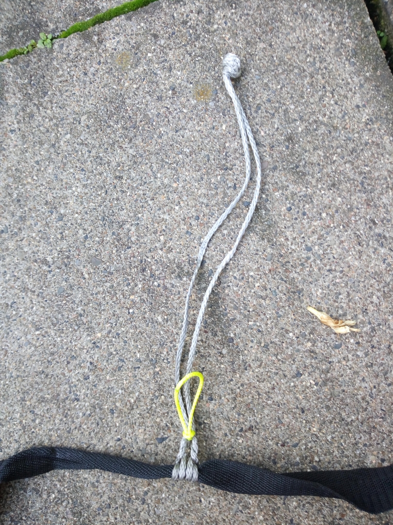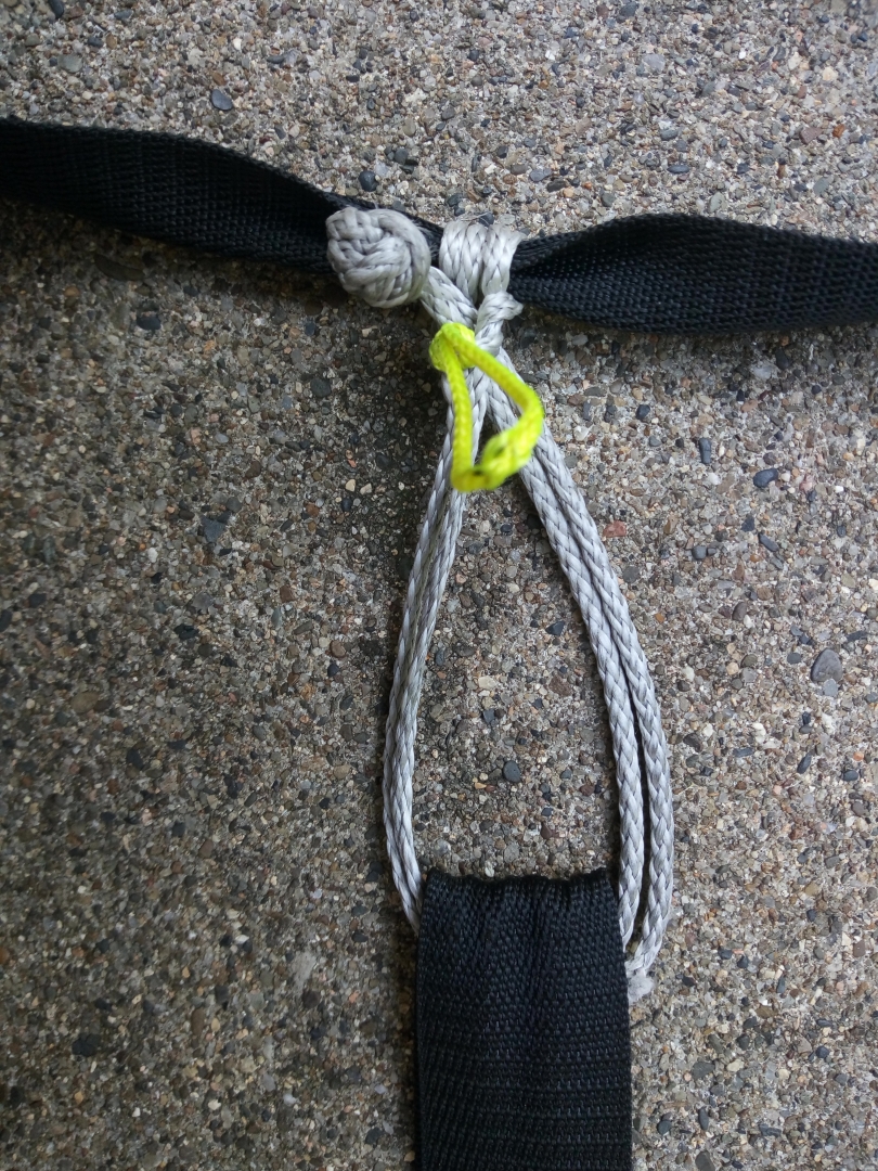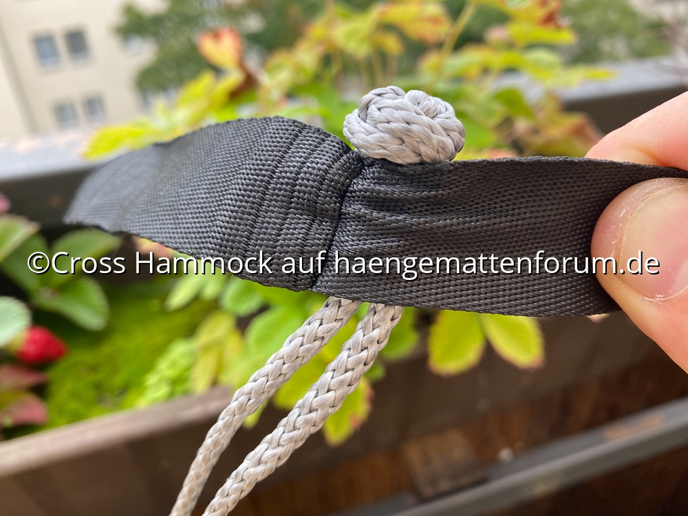 Erst als ich die Hängematte wieder abgebaut habe, bemerkte ich, dass der Knoten durch das Auge durchgerutscht war und die gesamte Aufhängung am Knoten in der Daisy Chain hing. Hier ist ein Foto davon, bei dem allerdings die rechte Aufhängung nicht im Vordergrund stand, weshalb das Problem nur schwer zu erkennen ist.