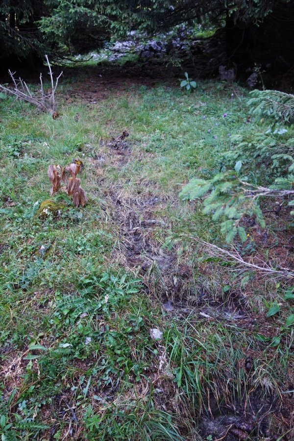 Da, beim Abstieg im Südwesthang fiel mein Blick bei der Suche nach einem Lager für die Nacht unweigerlich auf einen Kuhwechsel: