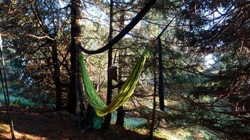 Ich war gewarnt, hier durfte ich meine Hängematte auf keinen Fall quer darüber hängen. Bald war ein schöner Platz mitten in einer kleinen Gruppe von Fichten gefunden: