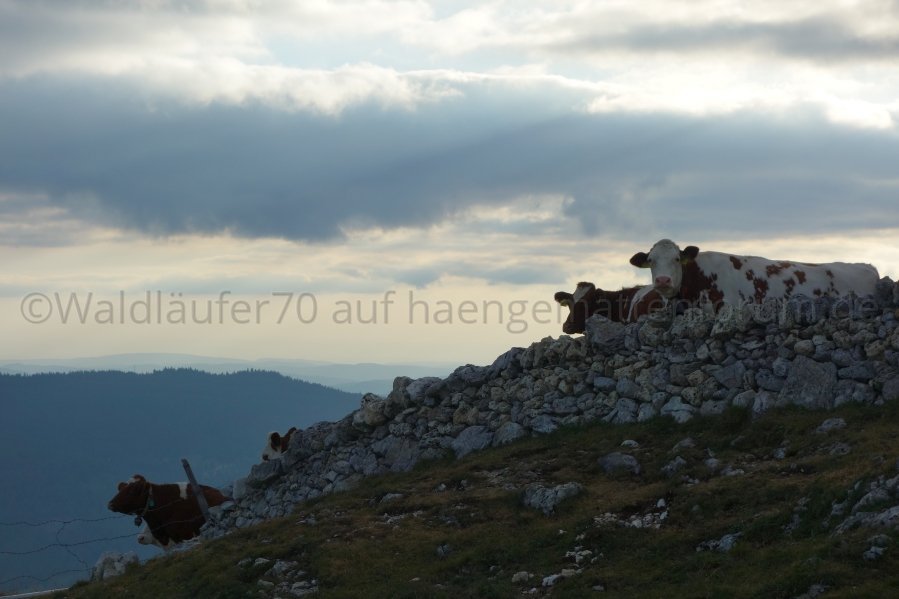 Gleich unterhalb des Gipfels der La Dôle im Schweizer Jura begrüssten mich am Montagabend ein paar Kühe, welche ich im Abendlicht porträtierte: