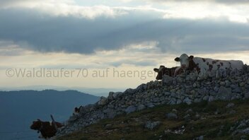 Da muss im Tal der Ruf des Bergbauern erschallt sein. Als ob sie gerufen worden wären, setzten sich die Kühe beim Berggipfel oben in Bewegung gen Tal und alsbald galoppierten sie an meinem Hängplatz vorbei, die einen ein ganzes Stück unterhalb über die Alpweiden, einige in einer grasbewachsenen Furche etwas oberhalb von meinem Platz und ein paar Tiere unmittelbar neben meiner Hängematte und meinem Kochgerät vorbei, ich nur geschützt durch eine Gruppe von vielleicht drei Fichten.
