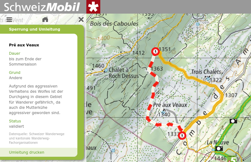 Gerade auf der Schweizer Karte der Stiftung "SchweizMobil" entdeckt: Ein Abschnitt eines Wanderwegs, der über eine Weide mit Mutterkuhhaltung führt, ist zurzeit gesperrt, weil die Mutterkühe aufgrund der Präsenz des Wolfes in letzter Zeit ein aggressives Verhalten gezeigt haben, das anscheinend über den "normalen" Rahmen hinausgeht: