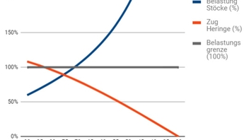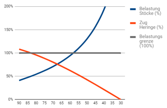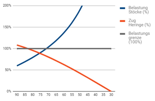 Zwischen den roten Bereichen «zu steil aufgerichtet» und «zu stark geneigt» gibt es einen gewissen grünen Bereich. Zu dem habe ich dann auch noch eine Grafik, die von zahlreichen Faktoren wie Hängemattenlast, Hängewinkel, Stabilität der Trekkingstöcke und Haltekraft der Heringe abhängt.