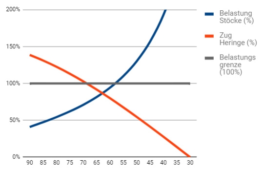- Wird der Stock zu stark geneigt, so wird die auf ihn einwirkende Längskraft höher, was durch die zusätzlich benötigte Länge weiter verschärft wird.