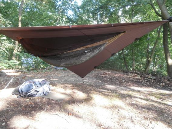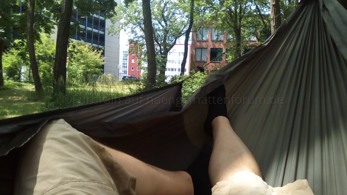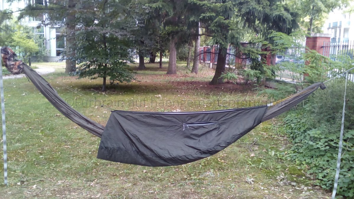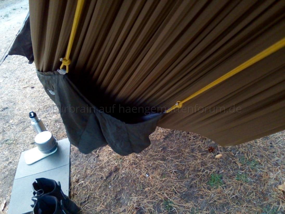 Habe den von mir "gekürzten" T-a-R Slacker Snuggler nun beim August-Onenighter des Berliner Stammtischs benutzt und bin sehr zufrieden. Mit dabei hatte ich meine fünfte DIY-Hängematte – "Coconut" (340 cm, 1.6 oz Hexon W, 40D, Coyote Brown, 395g) und drum herum ein selbstgenähtes Fronky-Moskitonetz.