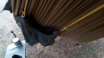 Die sich verjüngenden Enden und die damit vorgegebene Form sind eher ein Problem, besonders wenn man mit einer langen Hängematte diagonal schläft. Wie sich herausstellte, muss man sehr darauf achten, dass das Kopfende des Snugglers auch hoch genug positioniert ist. Sonst schmiegt sich die vorgegebene Passform nicht gleichmäßig an den Rumpf, sondern es bildet sich im unteren Bereich einen relativ großer Luftraum zwischen UQ und Hängematte, der u. U. Kältebrücken motivieren könnte. Erschwert wird dieses potentielle Problem dadurch, dass die Enden mit nicht-dehnbarem Polyesterband gesäumt sind, was bei mir zumindest am Fußende eine Öffnung ließ, aus der erwärmte Luft entweichen könnte (siehe Foto unten). Allerdings habe ich in den Sommernächten nicht mit Kältebrücken zu kämpfen gehabt, auch war der Druck vom Polyestersaum kaum zu spüren.