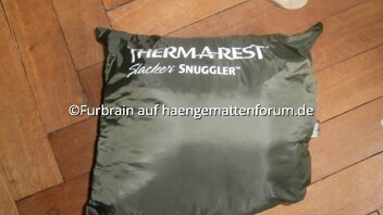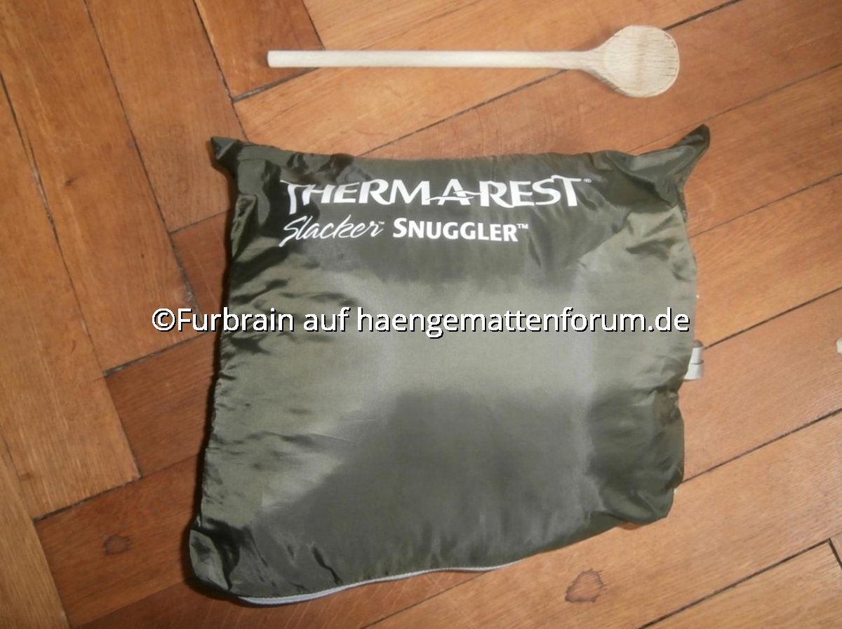 Da mein selbstgenähter DIY-Underquilt "Hysooqui" aufgrund seiner fluffigen Climashield-Füllung recht voluminös im Packmaß ausgefallen ist, habe ich mir für die lauen Sommernächte den Therm-a-Rest Slacker Snuggler zugelegt. Ich wollte etwas haben, was weniger Platz in der Tasche einnimmt und wärmemäßig nicht droht, im Sommer überdimensioniert zu sein, so dass ich nachts zu sehr in der Hängematte schwitze.