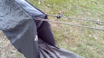 Ich habe ihn "gekürzt", indem ich ihn mittels zweier Schlaufen an den Längsseiten zum 3/4-UQ degradiert habe. Orientiert habe ich mich an der Länge des Warbonnet Yeti von knapp 160 cm, wobei ich das sich verjüngende Kopfende hier mit eingerechnet habe. Vom Fußende aus gesehen habe ich 58 cm weiter oben die Schlaufen gesetzt und mit einem entsprechend längeren Shockcord versehen, das um den Whip am Fußende der HM gelegt wird.