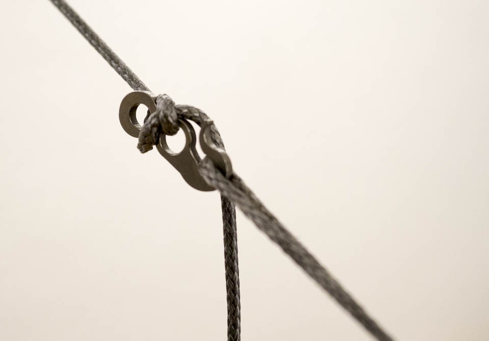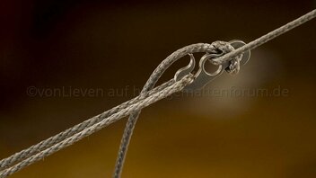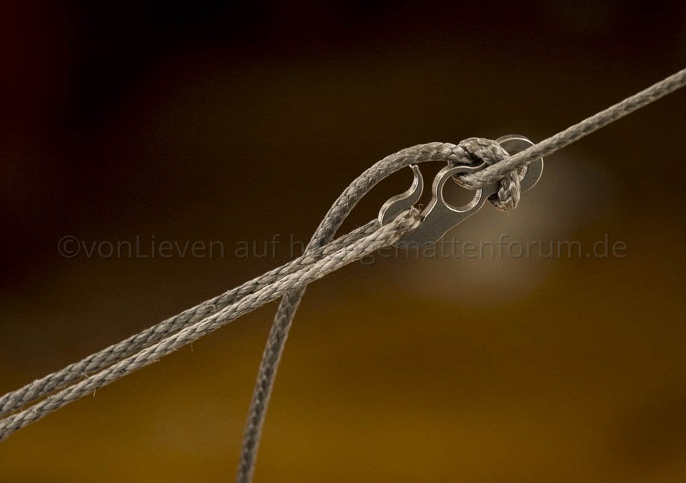• Im Moment kann ich noch keinen Unterschied zwischen meiner Lösung und der Verwendung des Dutch Hooks mit einer Whoopi Sling erkennen. Die Belastung der Schnur an der Durchführung im Hook dürfte in beiden Fällen in etwa gleich groß sein.