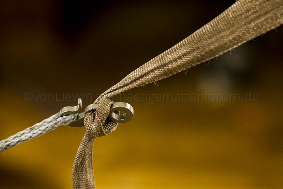 Ich könnte ja mal ein paar Meter vom Lawson Ironwire Fusion abschneiden, und mit den Double Hammock Whoopie Hooks verwenden. Die Bruchlast ist ähnlich wie die vom 7/64" AmSteel, aber es ist ummantelt. Vielleicht funktioniert das besser.