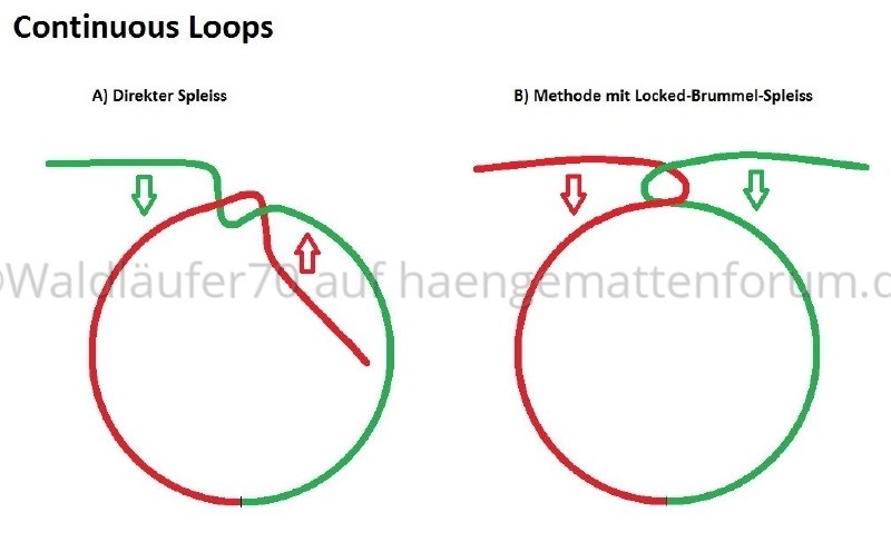Bis vor kurzem kannte ich nur die in Video 1 gezeigte Bauweise (siehe unten), die ich immer für nicht 100% sicher hielt, weil die beiden Spleisse - abgesehen von je einem Durchstich - nur gesteckt sind. Nun hat mich [USER="46"]TreeGirl[/USER] kürzlich aber darauf hingewiesen, dass es auch bei einem Continuous Loop möglich ist, einen «Locked Brummel» einzubauen: eine Führung der Durchstiche, die eine Verbindung bildet, die sich nicht ohne weiteres lösen kann.