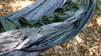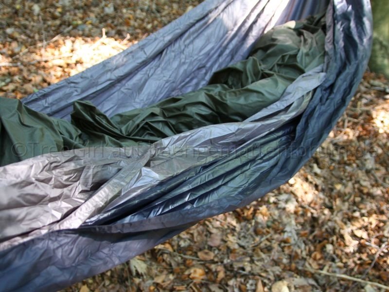 Die Jarrah ist eine normale, doppellagige Hängematte ohne Netz. Es gibt keine ungewöhnlichen oder neuen Features, weshalb man sich unbedingt diese Hängematte kaufen müsste. Aber das Angebot an doppellagigen Hängematten ist in Europa dürftig, deshalb wäre die Jarrah für Einsteiger die eine Isomatte als Isolierung verwenden wollen zunächst einmal nicht uninteressant. Ich habe sie zwar mit einem Underquilt verwendet, brauchte aber zwei Lagen um eine übermäßige Dehnung zu vermeiden. Die verwendeten Stoffe sind Pertex® Quantum 55g außen, und Pertex® Quantum 35g innen. Einlagig verwendet wie bei der Mugga oder Karri haben sie mehr Dehnung als ich vertrage. Zusammen haben sie eine vergleichsweise geringe Dehnung.