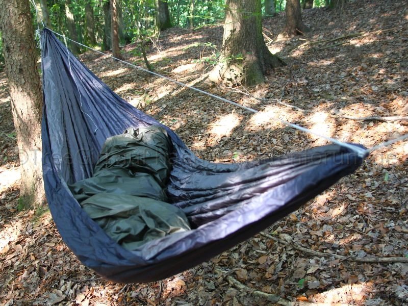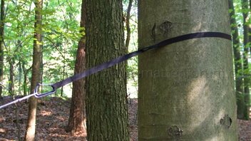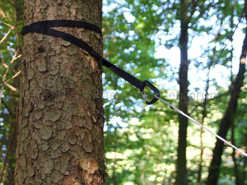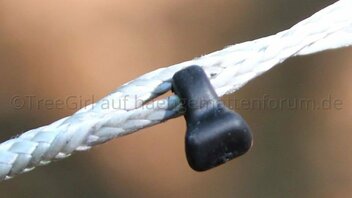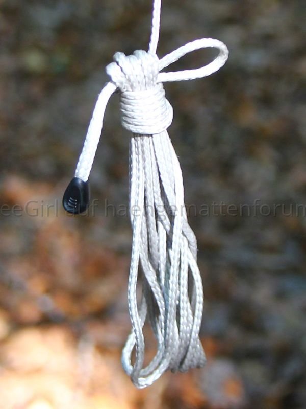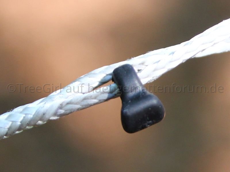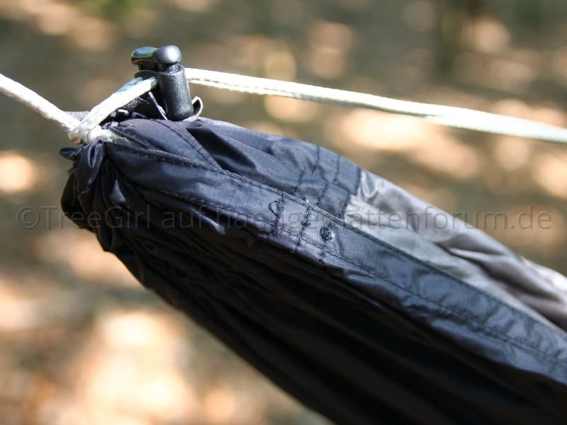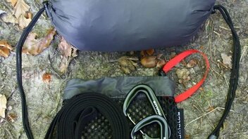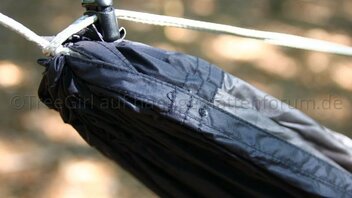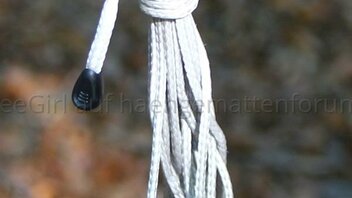 Geliefert wurde die Jarrah in Einzelteilen, d.h. Aufhängung und Ridgeline waren nicht installiert. Die Hängematte kam zusammengerollt in einem kleinen Packsack. Die Aufhängung bestehend aus Gurten, Whoopie Slings und Karabinern, und eine verstellbare Ridgeline waren in einem noch kleineren Packsack verpackt. Um die Hängematte nutzen zu können, musste ich Aufhängung und Ridgeline erst einmal installieren. Kein Problem für jemanden, der ein wenig Ahnung von der Materie hat, aber wie Mittagsfrost bereits bei der Mugga schrieb, ist es für einen Anfänger vermutlich nicht so einfach. Ich habe die verstellbare Ridgeline zuerst für eine Whoopie Sling gehalten, und habe den Kopf über die seltsame Konstruktion geschüttelt, bis mir klar wurde, dass ich eine Ridgeline in der Hand halte. Die Ridgeline ist aus dem gleichen Seil (2,5mm Liros?) gefertigt wie die Whoopie Slings und unterscheidet sich nur in den Maßen.