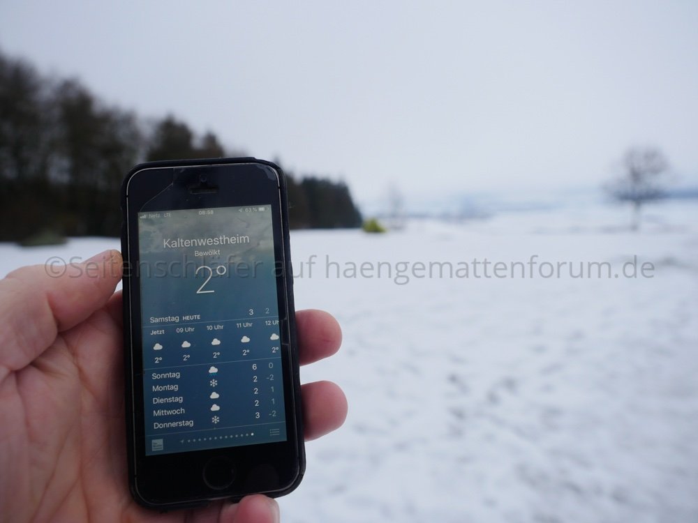 • Ich habe am Wochenende zwei Nächte im Hängemattenständer und Daunenschlafsack übernachtet. Es herrschten Wetterbedingungen um den Gefrierpunkt - und zwar bei stürmischen Böen.