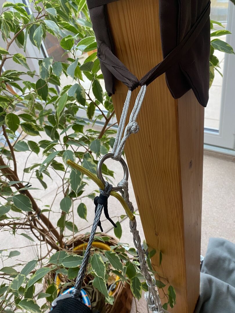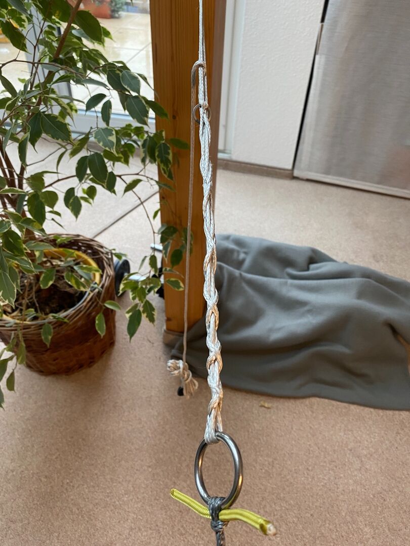 Ich hab die Vario Loop Nr.4 jetzt seit knapp einem Jahr im Praxistest. Die erste Version die ich nachgebaut habe ist immer noch bei meiner XLC am Fußende angebracht und sie ist die am häufigsten verstellte Seite. Wenn ich nicht auf Tour bin hängt die XLC im Wohnzimmer. Das Kopfende ist aus Platzgründen direkt an einem senkrechten Balken befestigt und am Fußende wir die Aufhängung eingestellt.