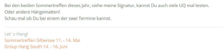• Hi, moin, hallo Marsch Pirat, 1,60m Breite der Hängematte ist bei Deiner Körperlänge knapp ok. Man liegt ja diagonal, also braucht die Hängematte fast die Breite Deiner Körperlänge, sonst fallen Kopf oder Füße raus. Das hat mit Bequemlichkeit nichts mehr zu tun. Meinerseits bin ich auch gespannt auf so einige Modelle, die ich (noch) nicht kenne und probiere trotz Saisongeschäft zum Treffen in /bei Kassel zu kommen. Dann gibt es da auch mexikanische Hängematten zum Schlaftest.