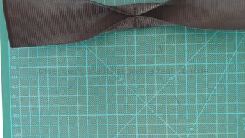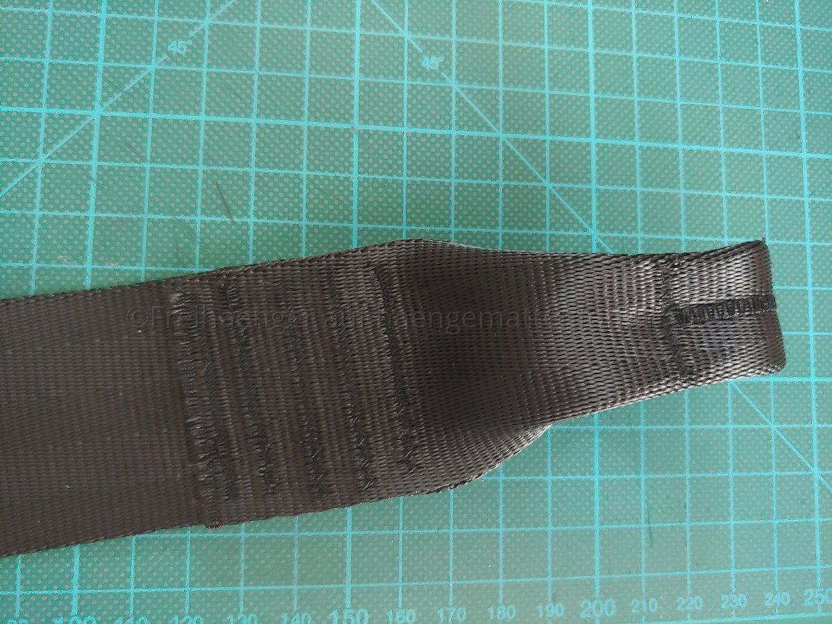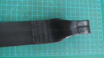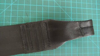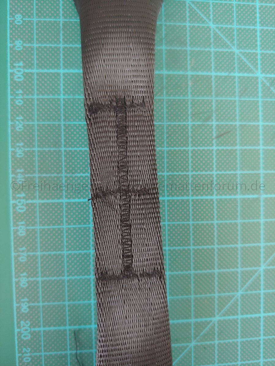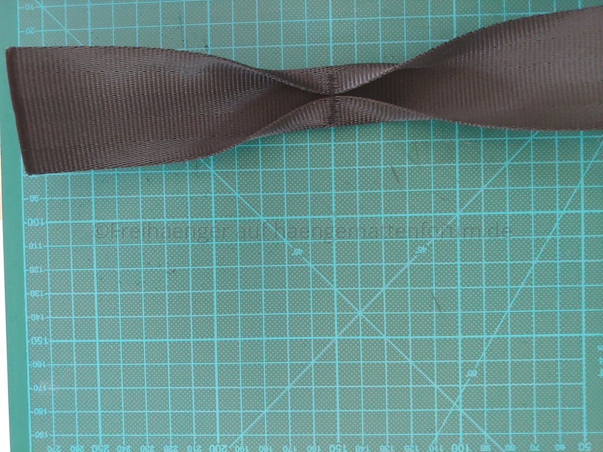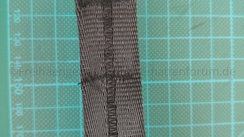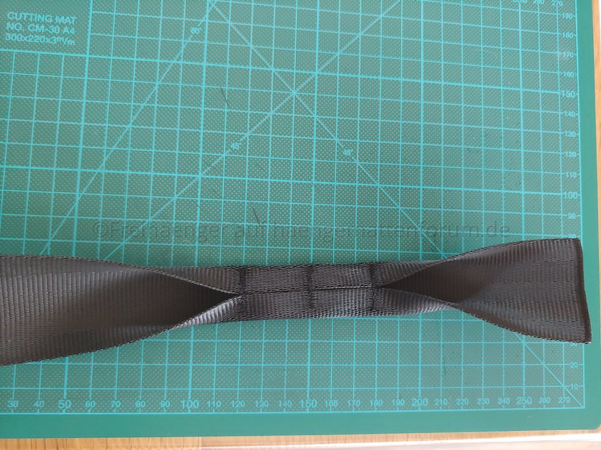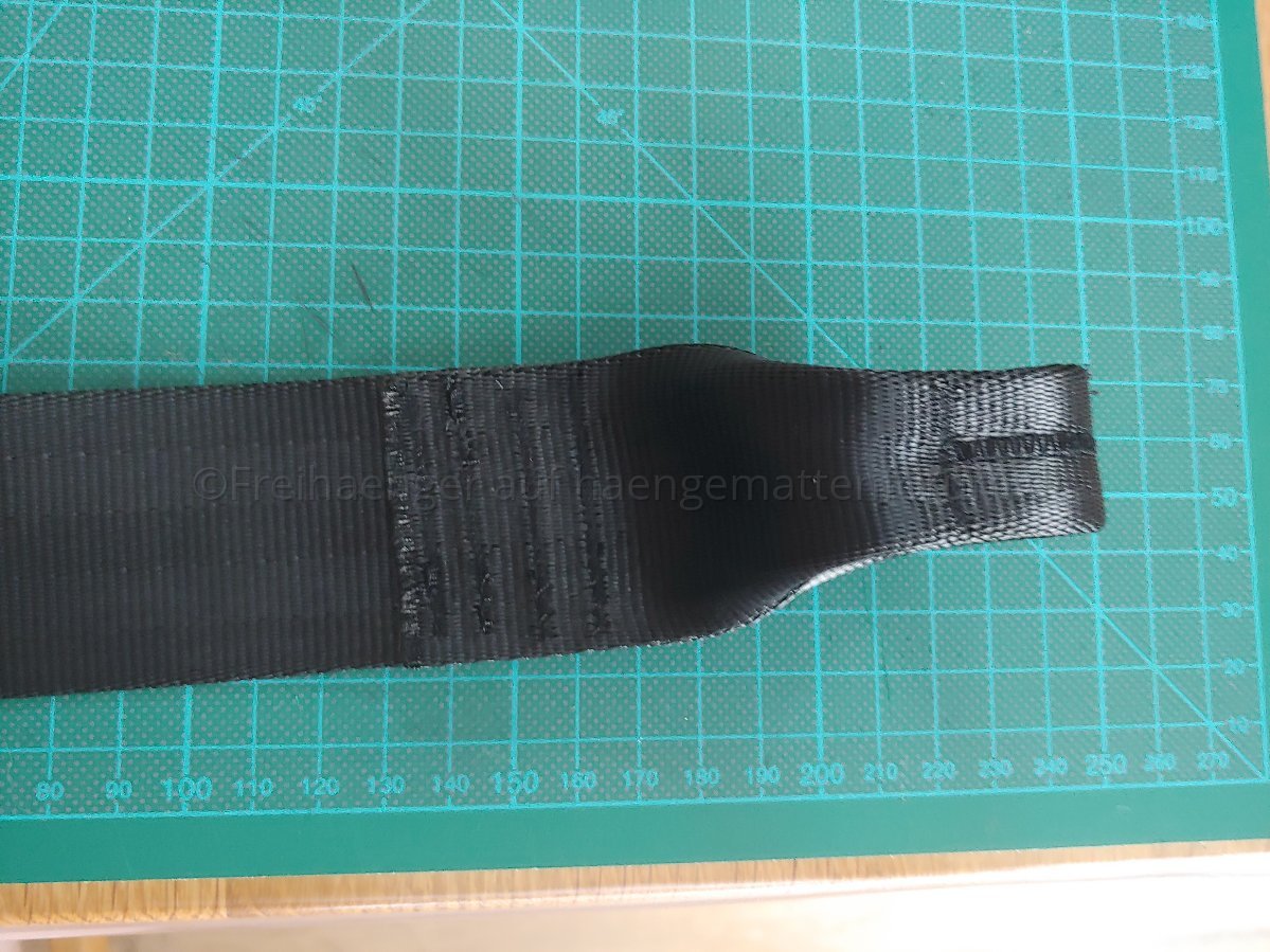 Jetzt wird die Schlaufe vorbereitet, dazu klappt man das Ende in Richtung des Gurts, das dass die "offenen" Stellen innen liegen und die mittlere Quernaht das Ende bildet.