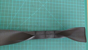 Nun den Spalt zwischen den Quernähten mit einer Längsnäht verschließen. Der Gurt hat nun eine Sanduhr-Form gebildet. Hier die spätere Außenseite.