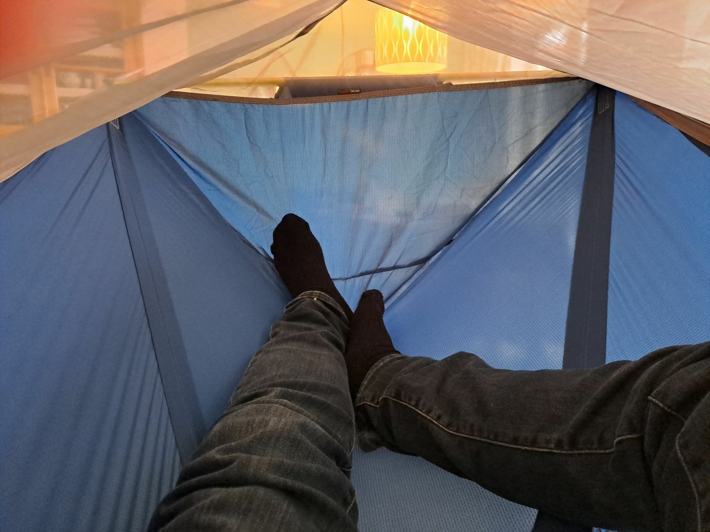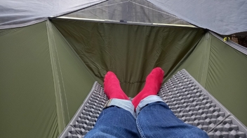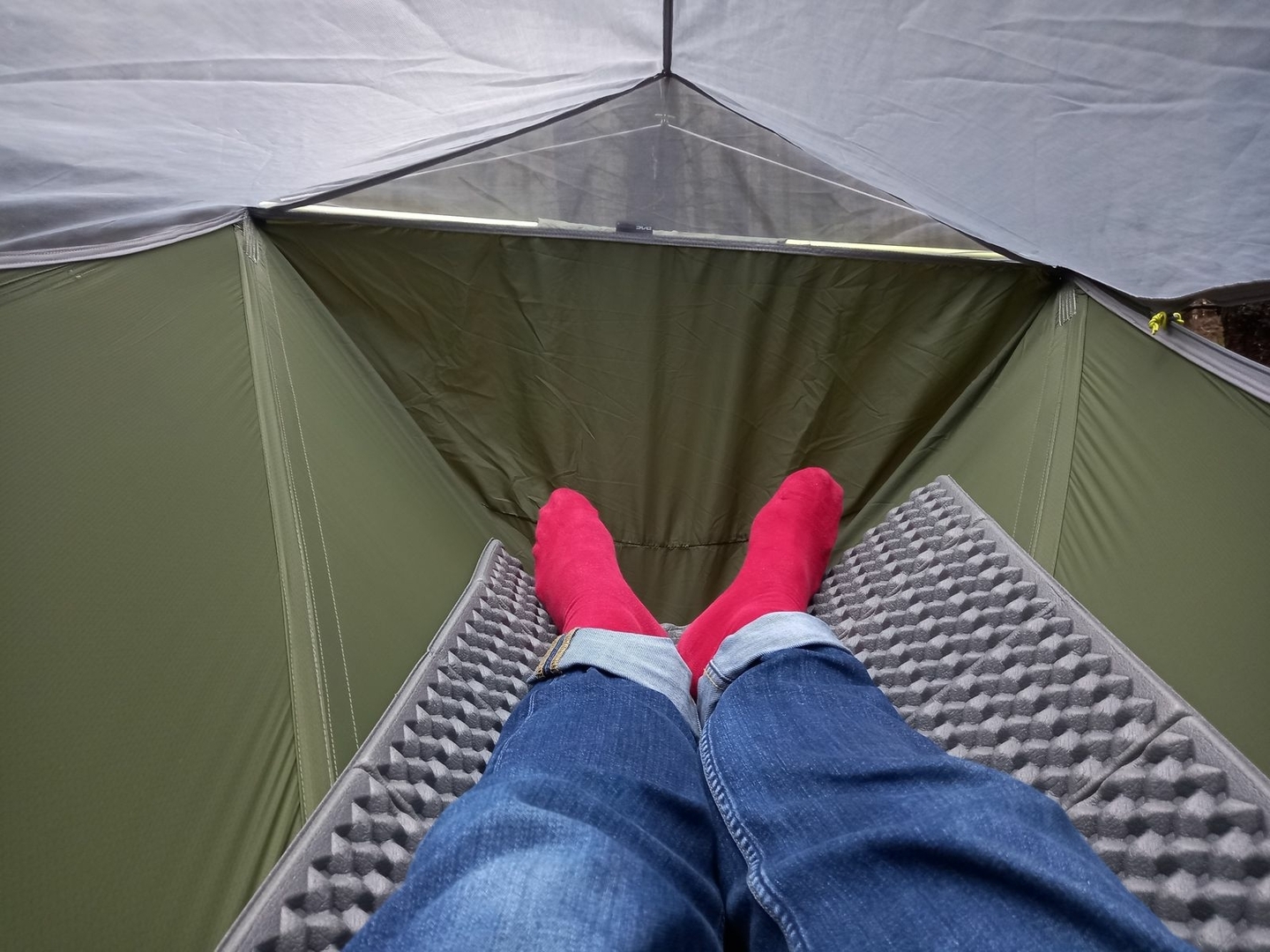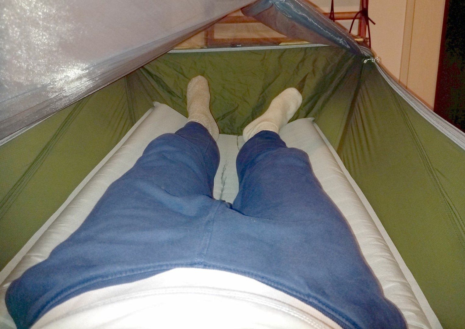 Ich bin eher Seitenschläfe und kann in der Skylite mit den Oberschenkeln im rechten Winkel zum Oberkörper liegen. Dafür ist aber eine Isomatte ab einer Breite von 60cm nötig. Wenn die Isomatte dazu dicker ist, wie z.B. meine Xtherm, dann kommen die Knien nicht an die Wände.