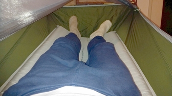 Die Matte war ca zur Hälfte aufgeblasen und hat Querrippen. Für mich war es damit leider extrem unbequem. Ich hatte einerseits das Gefühl immer rechts und links der Matte runter zu kippen und gleichzeitig hat sie sich in der Längsachse unter meinem Rücken aufgeschoben und gedrückt.