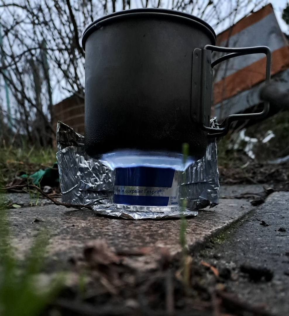 Möchte man es noch leichter: Es gibt auch noch den sogenannten Cat Can Stove.............das ist dann eine Sheba Futterdose ohne Tomatenmark Dose, mit oder ohne Füllung und mit 1-2 Reihen Löcher im oberen Rand der Dose gestanzt..........Spiritus rein, anzünden, Topf drauf......fertig.