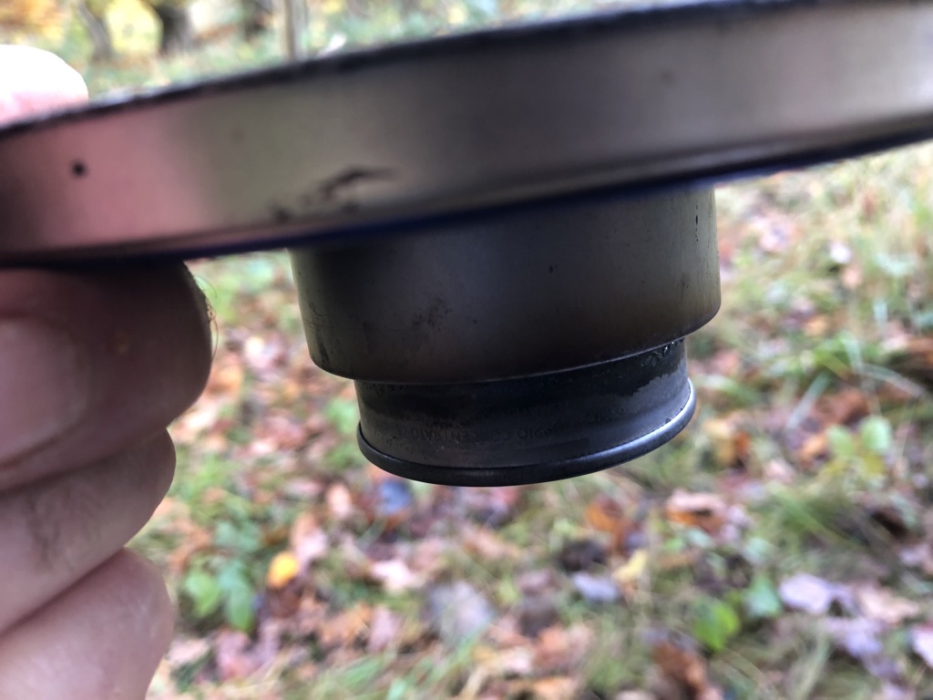 Seltsam. Ich nutze den immer mit dem Konussystem von TrailDesigns. Hier, wie die Flamme bei mir aussieht. Nach kurzer Zeit brennt der bei mir vollkommen blau. Je nach Windverhältnissen bekomme ich ganz leichten Russ am Topf; hat mich nie gestört, obwohl ich da heikel bin.