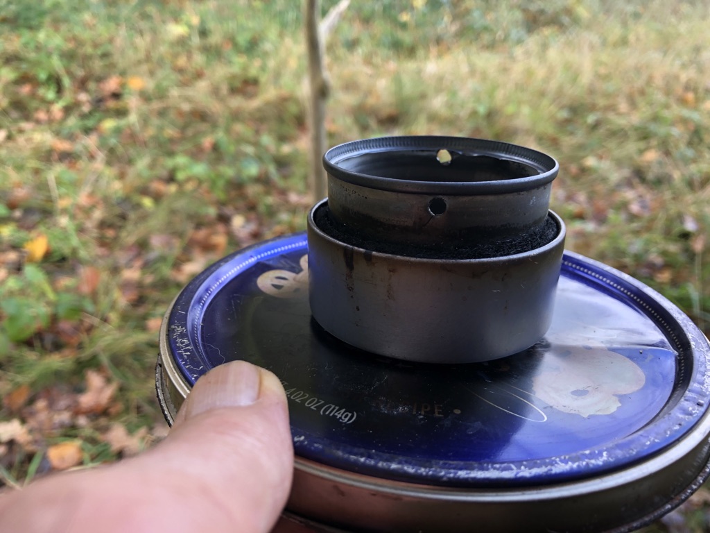 Möchte man es noch leichter: Es gibt auch noch den sogenannten Cat Can Stove.............das ist dann eine Sheba Futterdose ohne Tomatenmark Dose, mit oder ohne Füllung und mit 1-2 Reihen Löcher im oberen Rand der Dose gestanzt..........Spiritus rein, anzünden, Topf drauf......fertig.