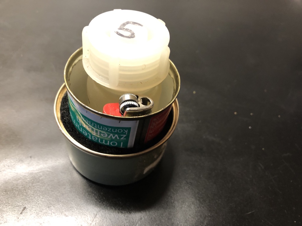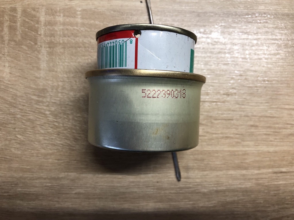 Hier noch einmal ein paar Bilder eines simplen DIY Fancy Feast Spiritusbrenner............eine passend gekürzte Tomatenmark Dose in eine kleine, runde Sheba Katzenfutter Dose gesteckt , um die Tomatenmark Dose eine Lage Carbonfilz gewickelt, noch 2-3 kleine Löcher in den unteren Rand der Tomatenmark Dose geschnitten damit Spiritus in den Carbonfilz gesaugt werden kann, plus 1-2 Löcher in den oberen Rand der Tomatenmark Dose für die Sauerstoffzufuhr geschnitten und fertig ist ein leichter und sehr effizienter Spiritusbrenner ![]()
