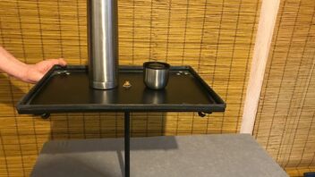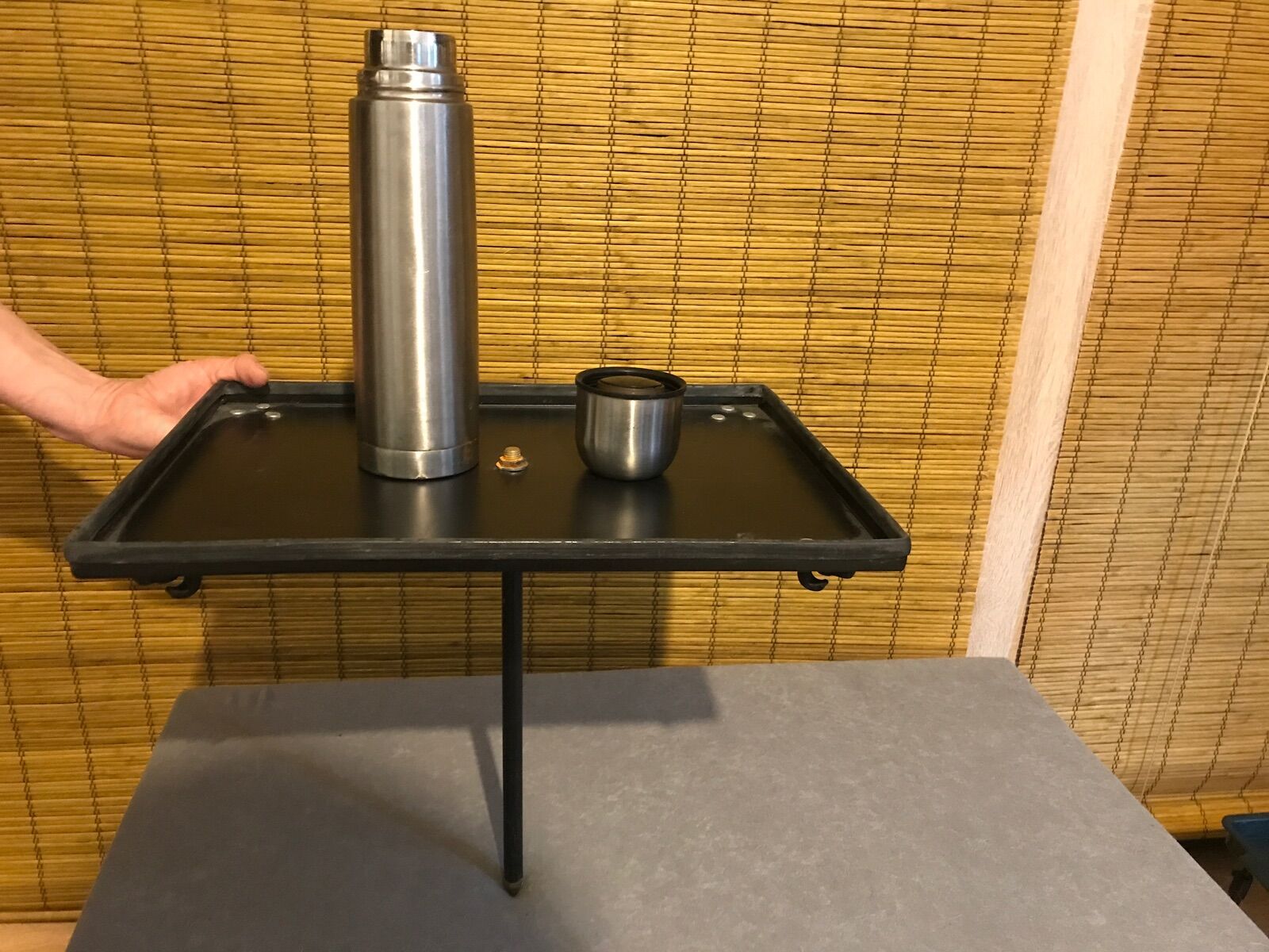 Hier noch meine DIY-Version des Tischchens, nicht so hochwertig und ggf. etwas schwerer da Sperrholz, lackiert, aber alles aus Rest-Material. Ich benutze es zB., um meine Schuhe trocken (und relativ Ameisensicher) hochzustellen, natürlich alles im Sitzen von der HM aus. Sicher auch im Winter von Vorteil...