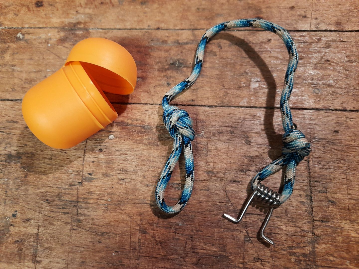 Feder aus einer Wäscheklammer. Stichsicher transportabel in einem Ü-Ei.