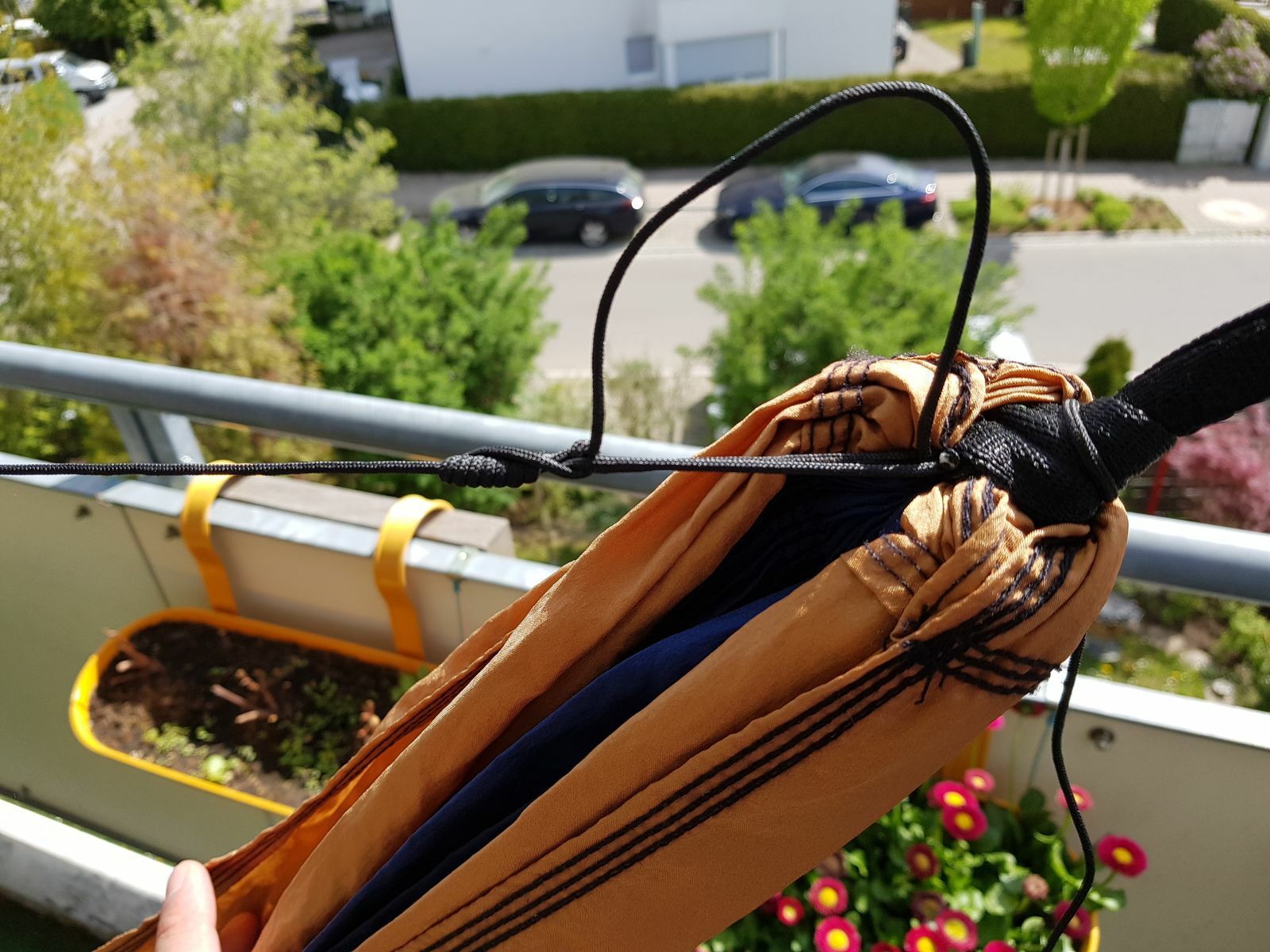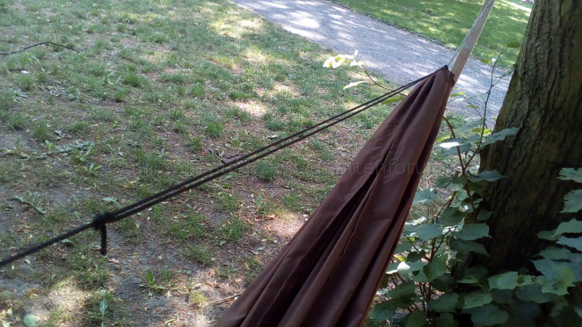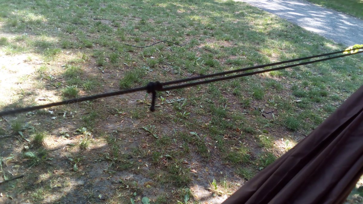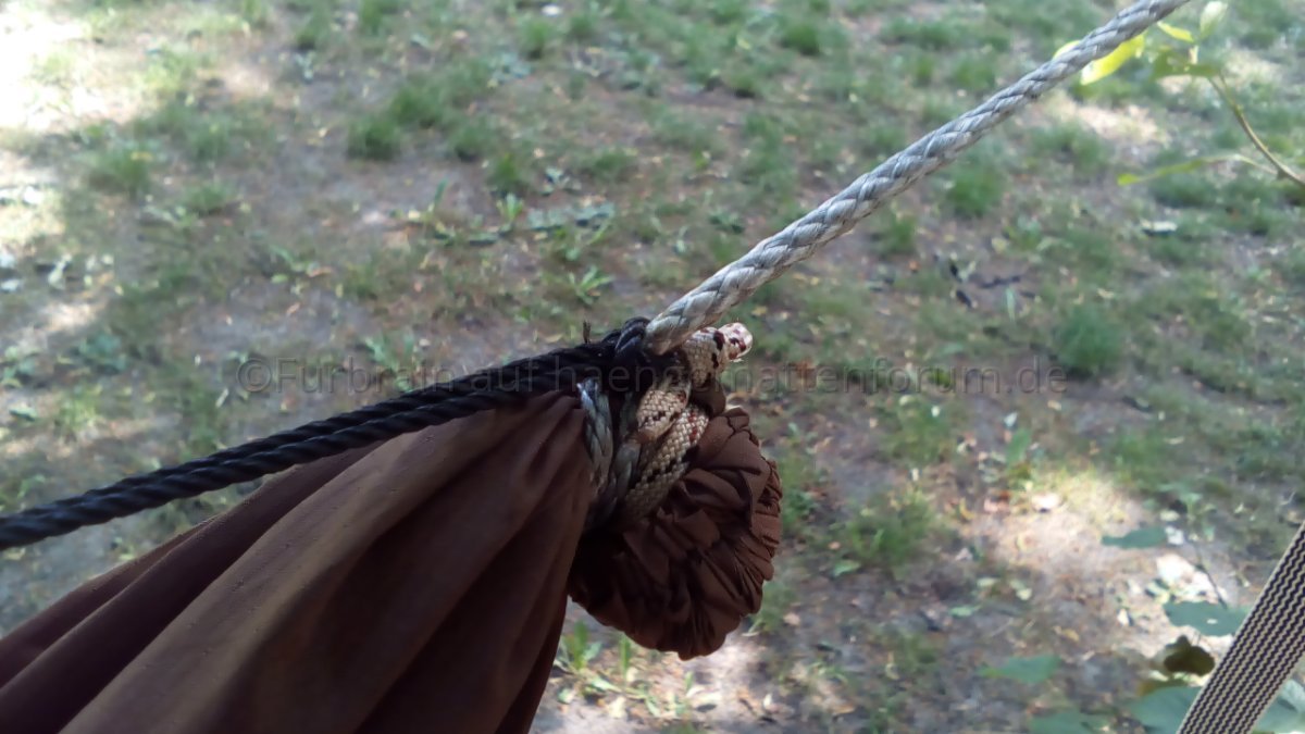 Somit kann ich mittels des verschiebbaren Prusik-Knoten die Distanz zum Ankerknoten verschieben und letzteren durch einfaches Lockern ein wenig lösen, um dadurch die Ridgeline-Länge zu verändern. Liegt man in der Hängematte und steht die Schnur unter Spannung, dann löst, dehnt und verschiebt sich nichts an der gewünschten Länge - Dank des Teermantels an der Nylonschnur.