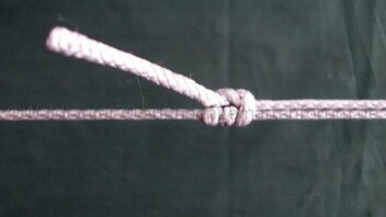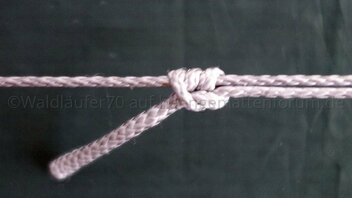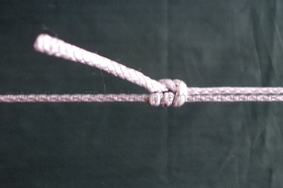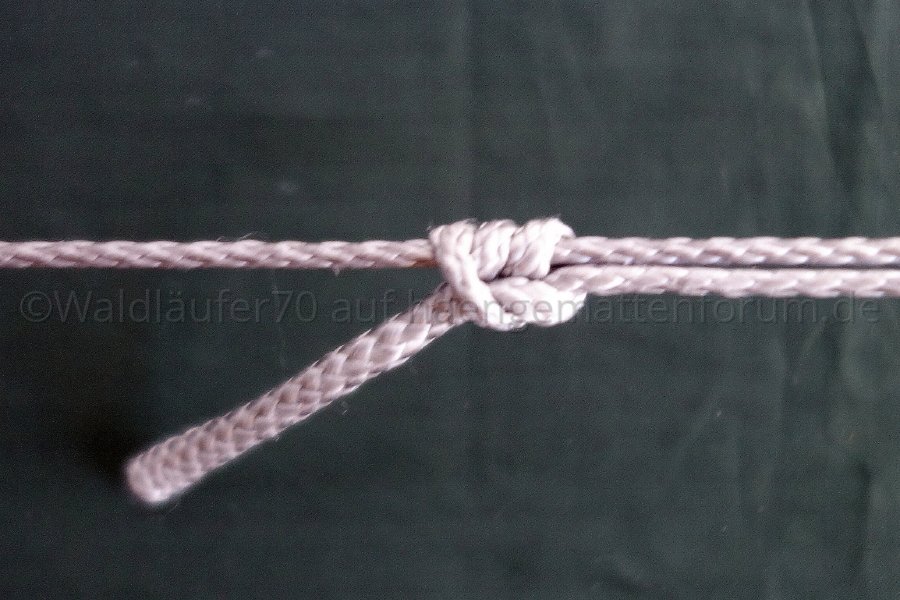 Während ich die RL am Fußende mit einer einfachen Schlaufe an der Aufhängung fixiert habe, geht am Kopfende die gewünschte Länge in einen Ankerstich ("Lark's Head") über.