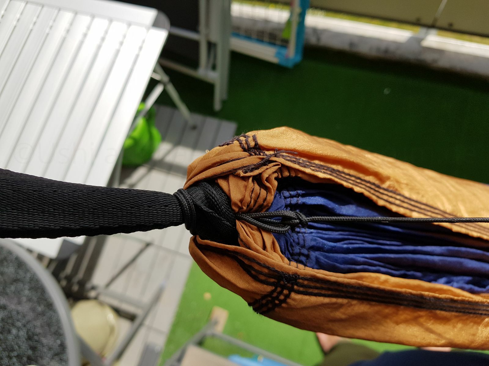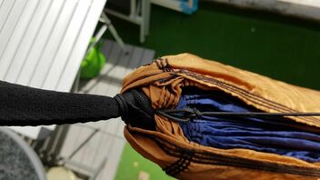 Was mich allerdings an Dyneema hier stört, ist nicht nur die geringe Farbauswahl grau oder gelb, sondern auch das verstellbare Ende der Whoopie Sling, das immer droht in die Hängematte zu hängen. Und tauscht man dann die Whoopie Sling gegen eine entsprechend bemessene Ridgeline aus, muss man mit der gewählten Länge leben.