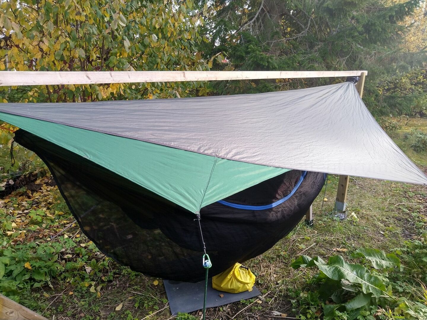 Das deckt nun auch die schmalen Enden etwas besser ab, die Sicht nach aussen ist fasst uneingeschränkt und natürlich wars kostenlos und hat Spass gemacht. Meine 11ft HM passt noch gut drunter, falls kräftiger Regen bzw. Wind vorausgesagt ist, nehme ich noch meine Viertel-/Halbsocke (aus ebendem grünen Tarpstoff) dazu. (Oder mein grosses Wintertarp halt.)