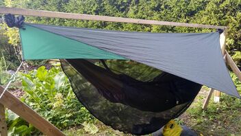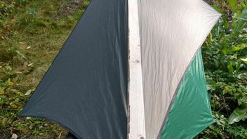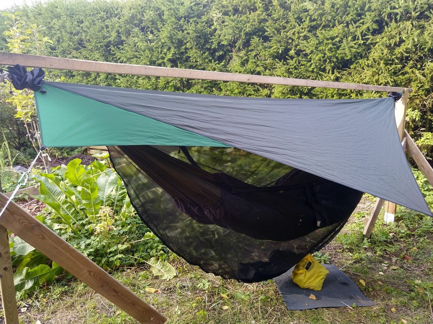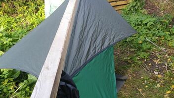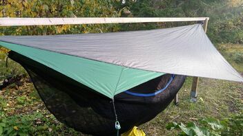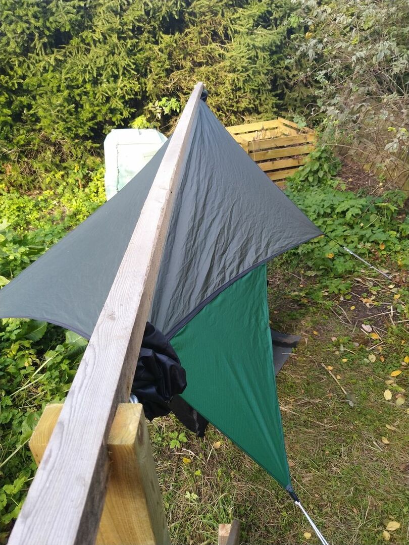 • ...etwas entlehnt da DIY, aber habe aus Tarp-Stoffresten mein Hennessy Explorer Asym-Rainfly zum Mini-Hex-Tarp gewandelt. Leicht und günstig: