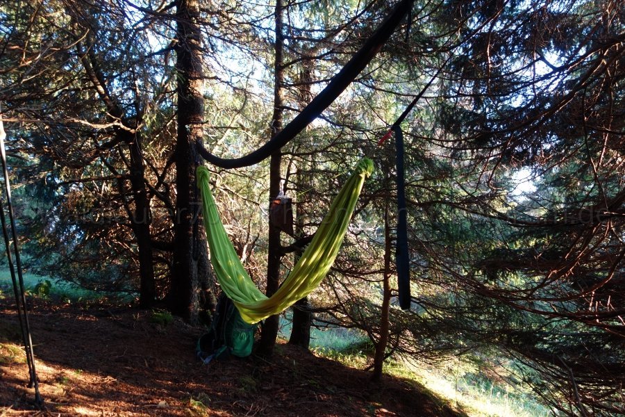 Einerseits wurde das Tarp tatsächlich ein wenig mehr gespannt, wenn ich in der Hängematte lag, weil sich die Baumbänder durch das Gewicht nach unten zogen. Andererseits habe ich dann noch an den Tie-Outs meiner Tarps immer 2mm-Shockchord-Schlaufen, die das sich senkende Tarp und die damit verbundene Entspannung der Seitenflächen aufgefangen haben. Diese sorgen ja auch dafür, dass das Tarp gestrafft bleibt, wenn es feucht wird und dass das Tarp bei Wind kurzfristig ein wenig nachgibt.