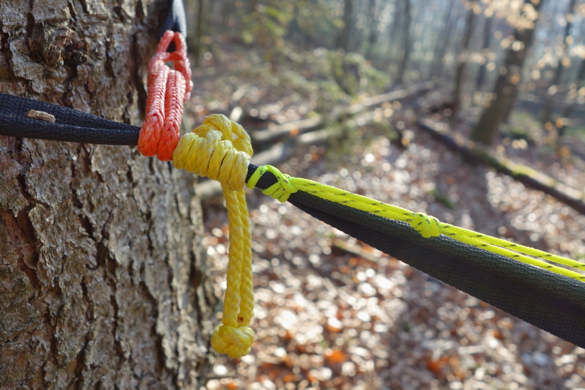 Ein besseres Gefühl habe ich natürlich, wenn die Prusiks möglichst nahe am Baum sind. Dafür nehme ich auch gerne wieder den etwas größeren Abstand zwischen Tarpfirst und Hängematten-Ridgeline in Kauf.