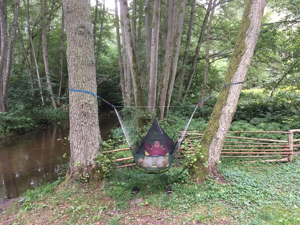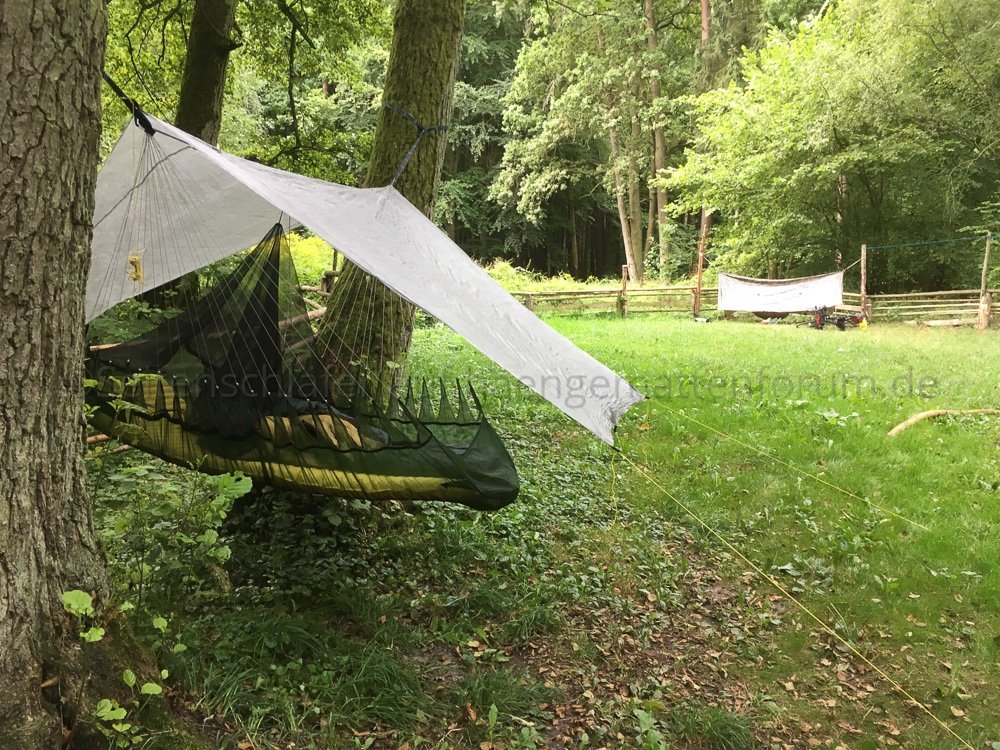 nicht aber für den längeren Hängeabstand einer GE-Hängematte. Omorotschka musste sich also an den Begrenzungspfählen des Platzes fixieren, die zum Glück hielten.