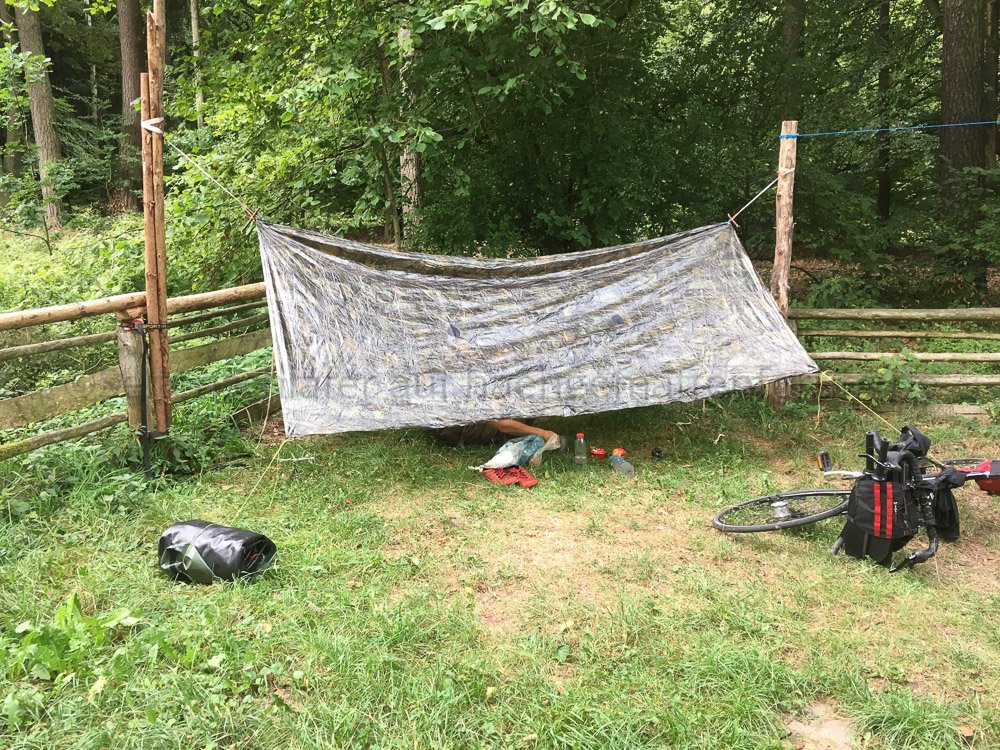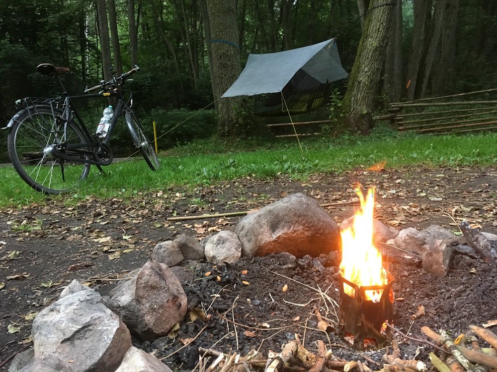 Anschließend sind wir dann zum offiziellen Wasserwanderrastplatz "Fegefeuer" geradelt und haben uns im Rahmen unserer bescheidenen Möglichkeiten alle Mühe gegeben, diesem Namen zu entsprechen. Der Rastplatz bestand aus einem eingehegten Kral, in dem sich zwar ein passendes Baumpaar für meine Cross Hammock fand,