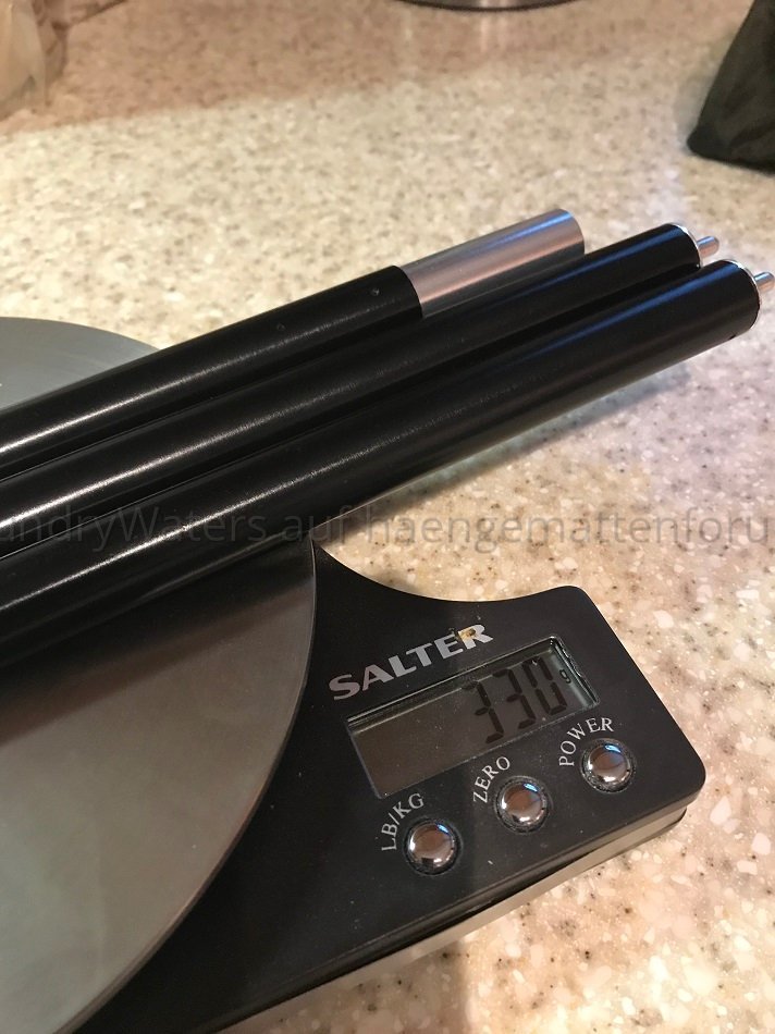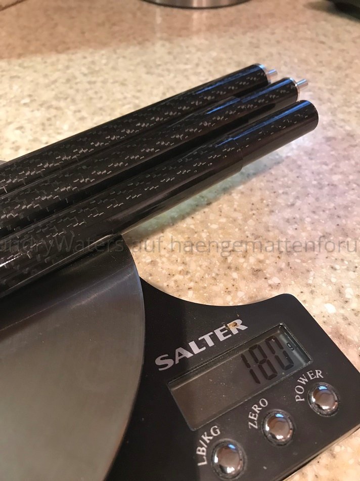 Ich gehoere zwar eigentlich nicht unbedingt zur UL Fraktion, wollte aber mal Carbon Spreizstaebe fuer die Warbonnet Ridgerunner ausprobieren. Zu kaufen gibt es die bei einem kleinen Hersteller im Bundesstaat Utah - Ruta Locura. Entweder jeweils zweiteilig ($85) oder der laengere Stab am Kopfende dreiteilig fuer $5 Aufpreis ($90). Gedacht als Ersatz fuer die spreader bars die standardmaessig mit der Warbonnet Ridgerunner kommen (also auch gleiche Ausmasse). http://www.rutalocura.com/