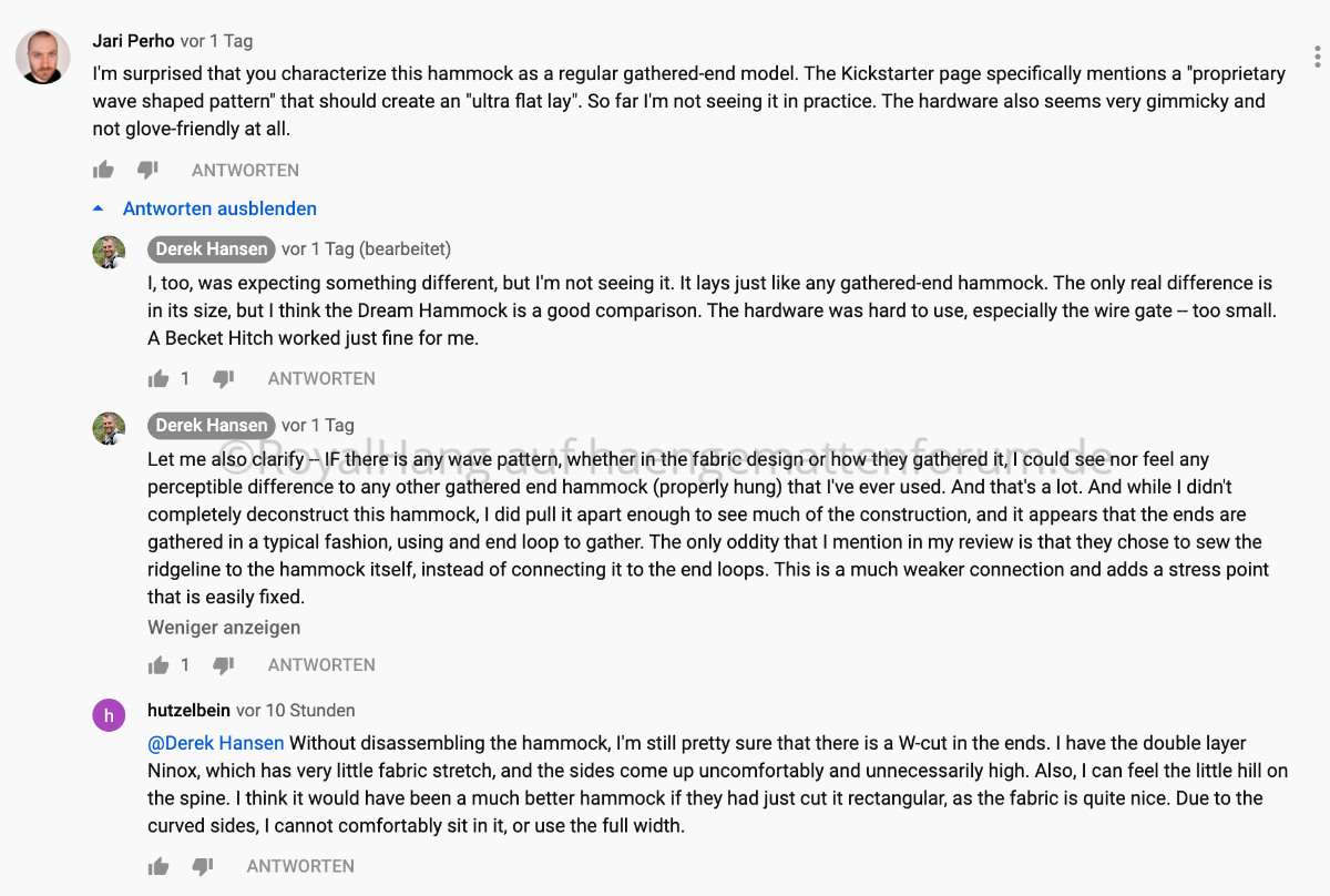 Nach meinem Urlaub werde ich nochmal ein paar Nächte in der Ninox verbringen, um ein faires Urteil zu fällen. Für den Moment habe ich den Test ausgesetzt, weil ich Erholung und guten Schlaf dringend nötig habe, und die Ninox einfach zuviel Aufmerksamkeit erfordert. Bisher ist das einzige, was mir wirklich gut gefällt der Stoff. Meine Vermutung ist, dass die Ninox ohne den ganzen Hokuspokus eine bessere Hängematte gewesen wäre.