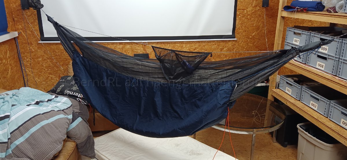 habe mir in meiner Werkstatt mal was zum hängen installiert um mal mit Knoten und Aufhängungen zu spielen. Habe auch den Moonquilt an die HM gehängt und siehe da es geht:saint: