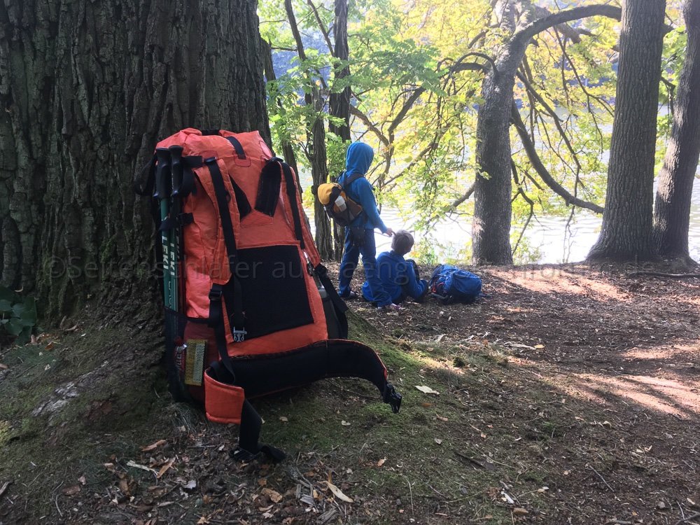 Hier drin stecken 2 Tarps, 2 Hängematten, 2 Isomatten, 3 Schlafsäcke, das Kochequipment, ein Campingstuhl, eine Angel und ein paar Klamotten. Macht 12 Kilo. Ich hoffe natürlich, dass sich diese Gewichtsverteilung in absehbarer Zeit im Zuge des Generationenvertrags umgekehrt haben wird.