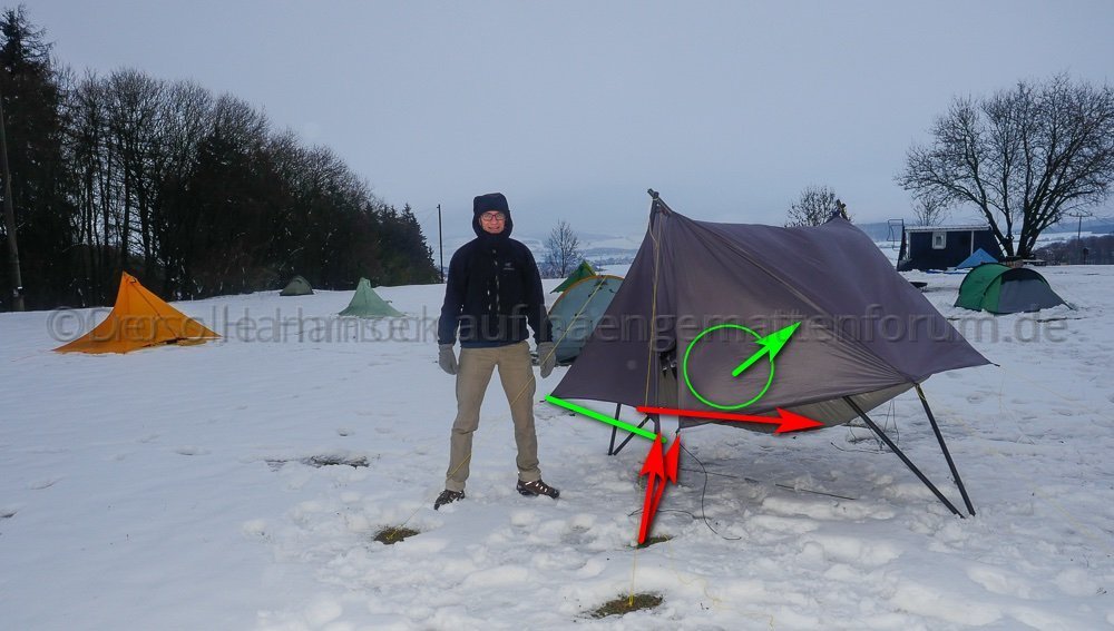 Aber auch eine Lastverteilung auf mehrere Häringe (wie weiter oben beschrieben) hätte die Situation deutlich entspannt. Es sieht ja nicht so aus, als wenn es dort Steine zum Beschweren gegeben hätte.